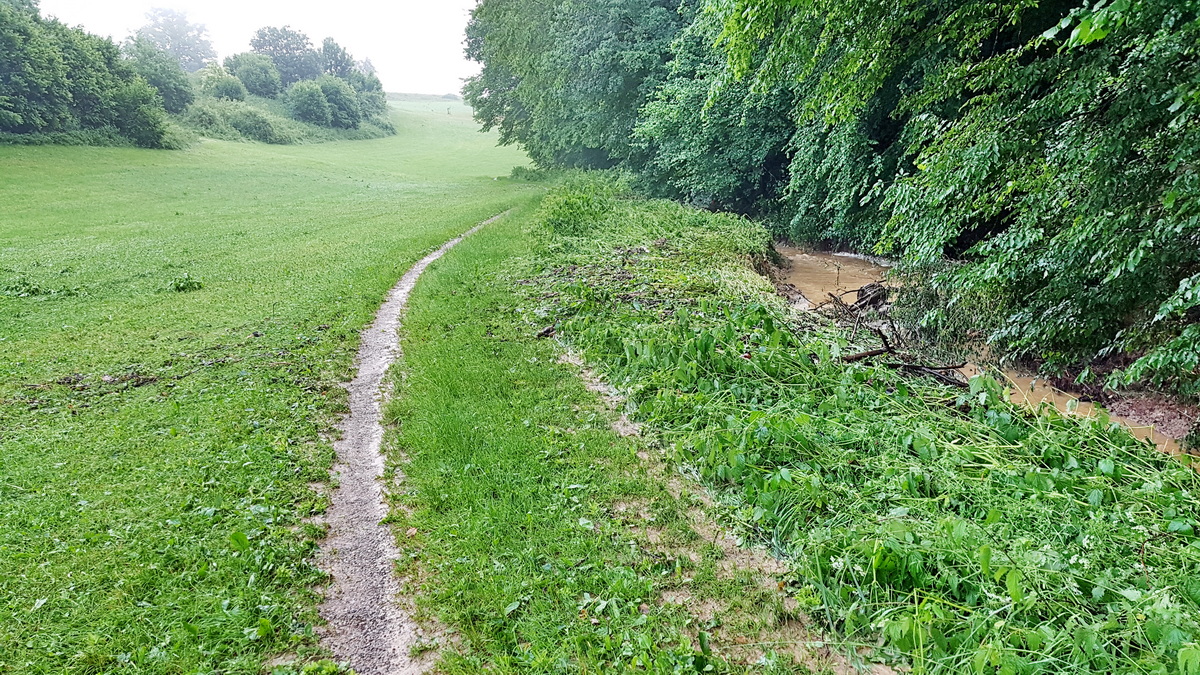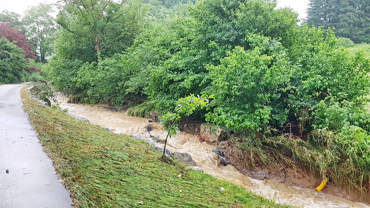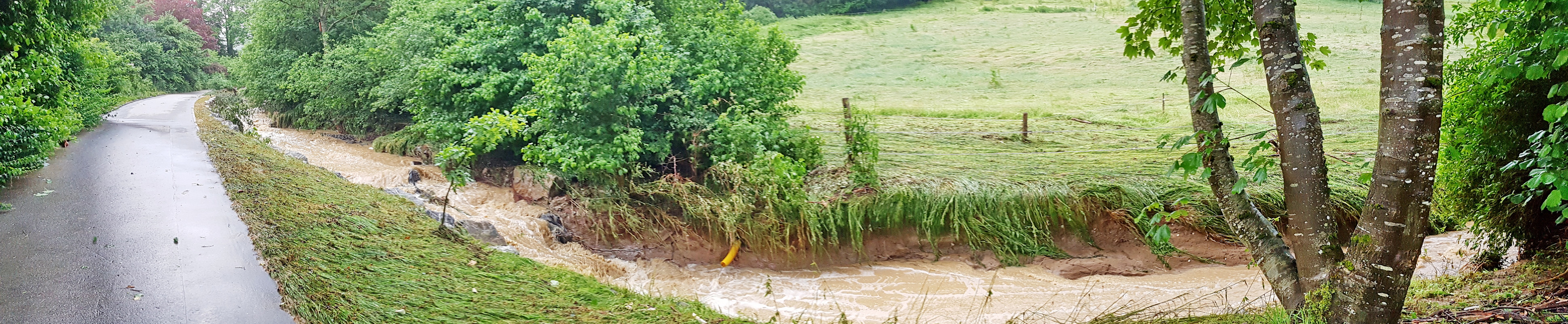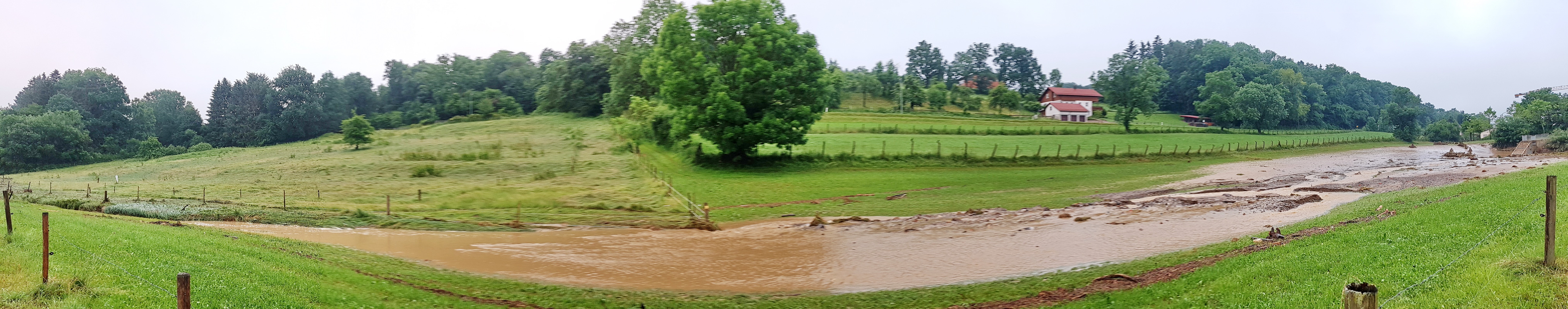 Wir liegen zum Glück 60 Höhenmeter über dem Bach, den man normalerweise trockenen Fußes überschreiten kann.