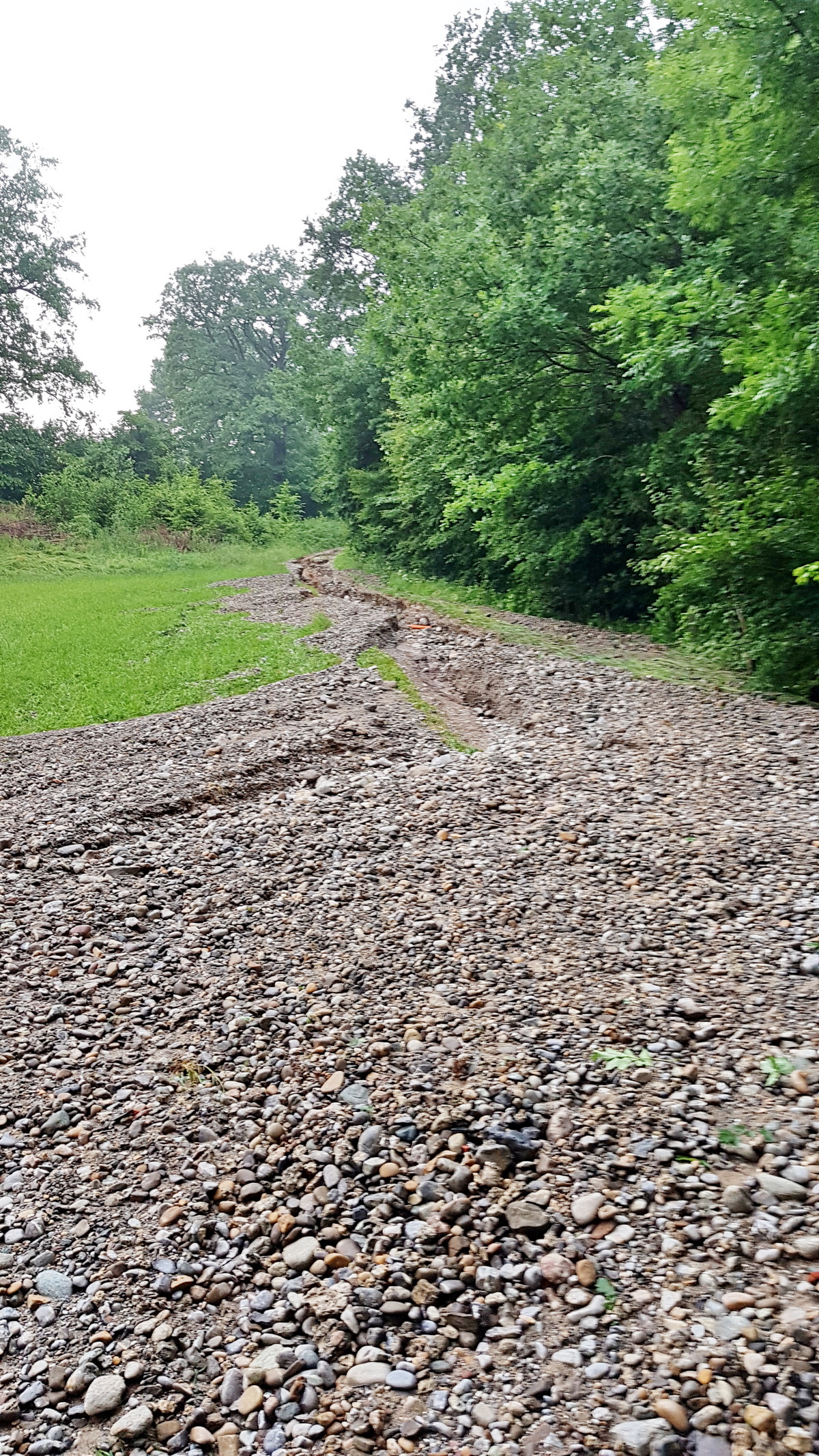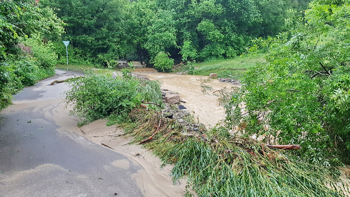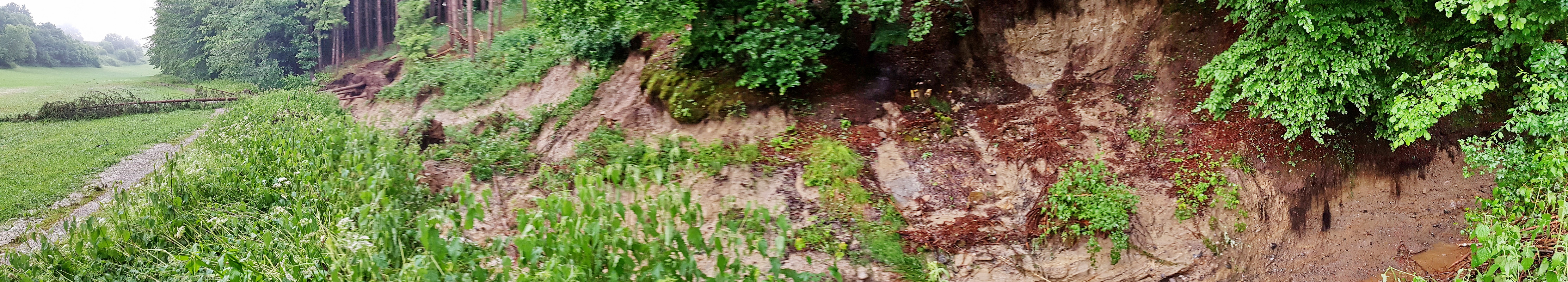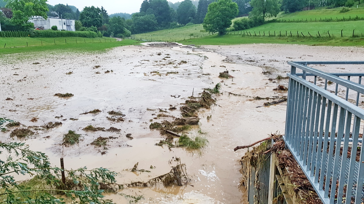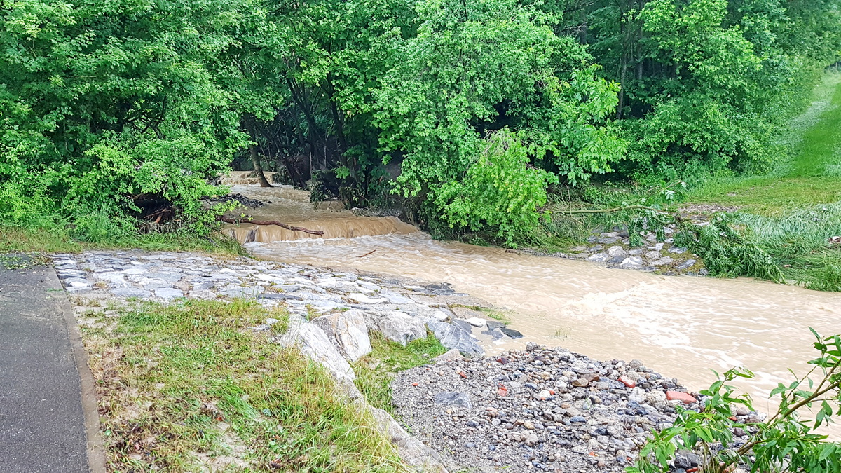 Wir liegen zum Glück 60 Höhenmeter über dem Bach, den man normalerweise trockenen Fußes überschreiten kann.